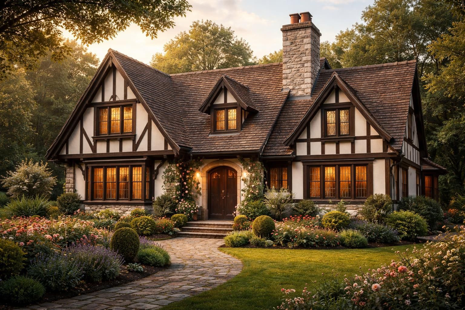 Les toits en pente jouent un rôle essentiel dans le style tudor. Ils rendent les maisons non seulement plus esthétiques, mais également fonctionnelles. En hiver, cette inclinaison permet la neige de glisser, réduisant la charge sur la structure. En été, les toitures en pente assurent une meilleure circulation de l’air, contribuant ainsi à une atmosphère intérieure agréable. Ce choix architectural démontre une compréhension poussée des conditions climatiques et un souci de la longévité des constructions.